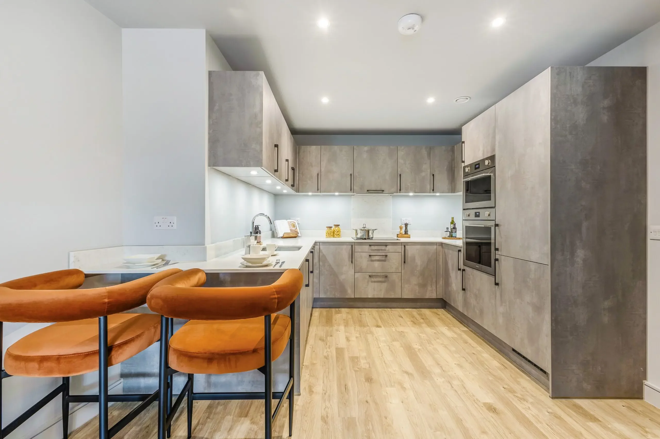 The open plan living area has been designed with modern living in mind, featuring a sleek handleless Häcker kitchen with Silestone Calacatta worktops, Siemens integrated appliances and ambient LED lighting. Full-height windows flood the space with light and open onto a private terrace that spans the width of the apartment — perfect for entertaining or unwinding outdoors.