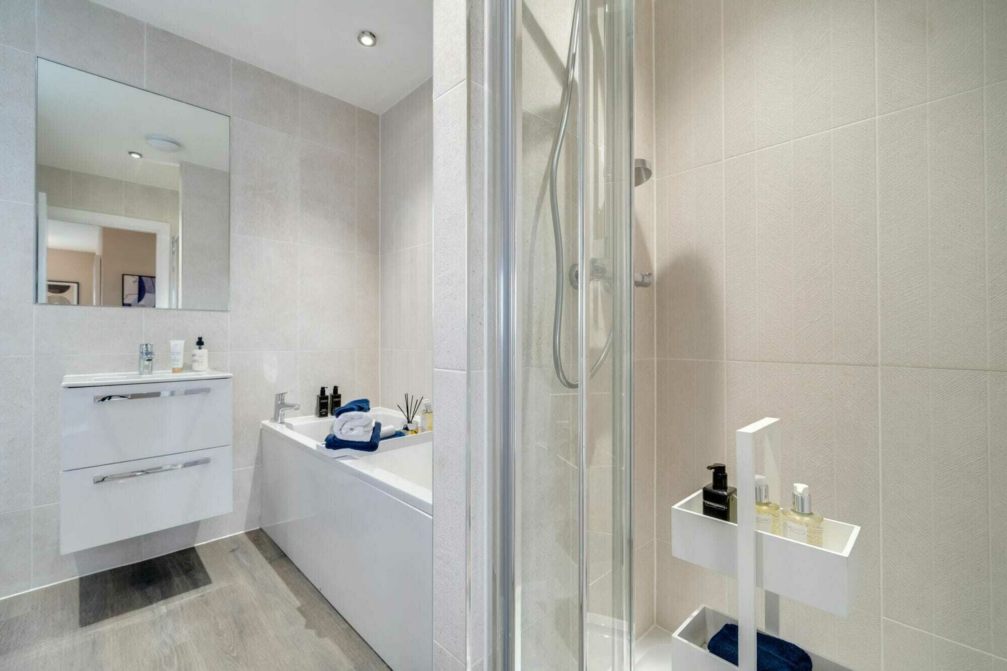 - Family bathroom has separate bath and shower